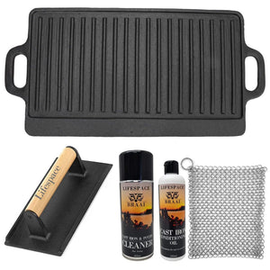 Lifespace Reversible Griddle Pan, Cast Iron Meat/Bacon Press & Cast Iron Care & Protect Bundle