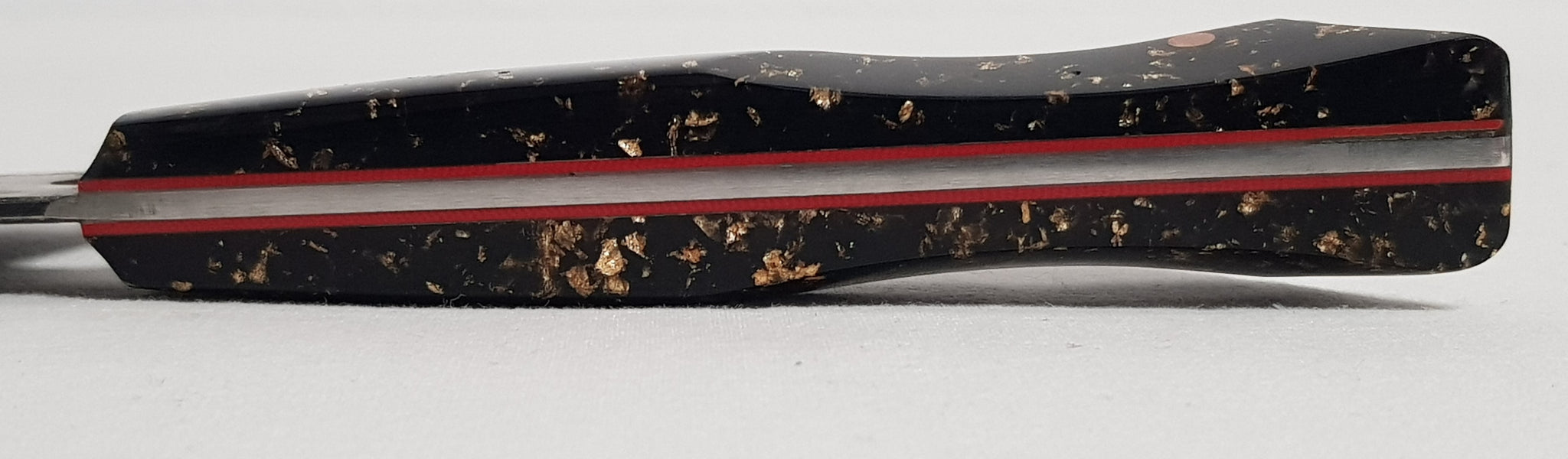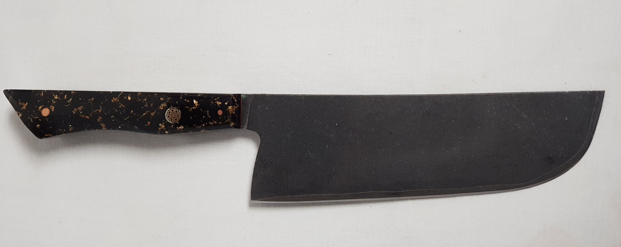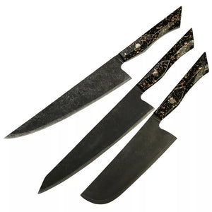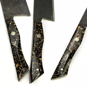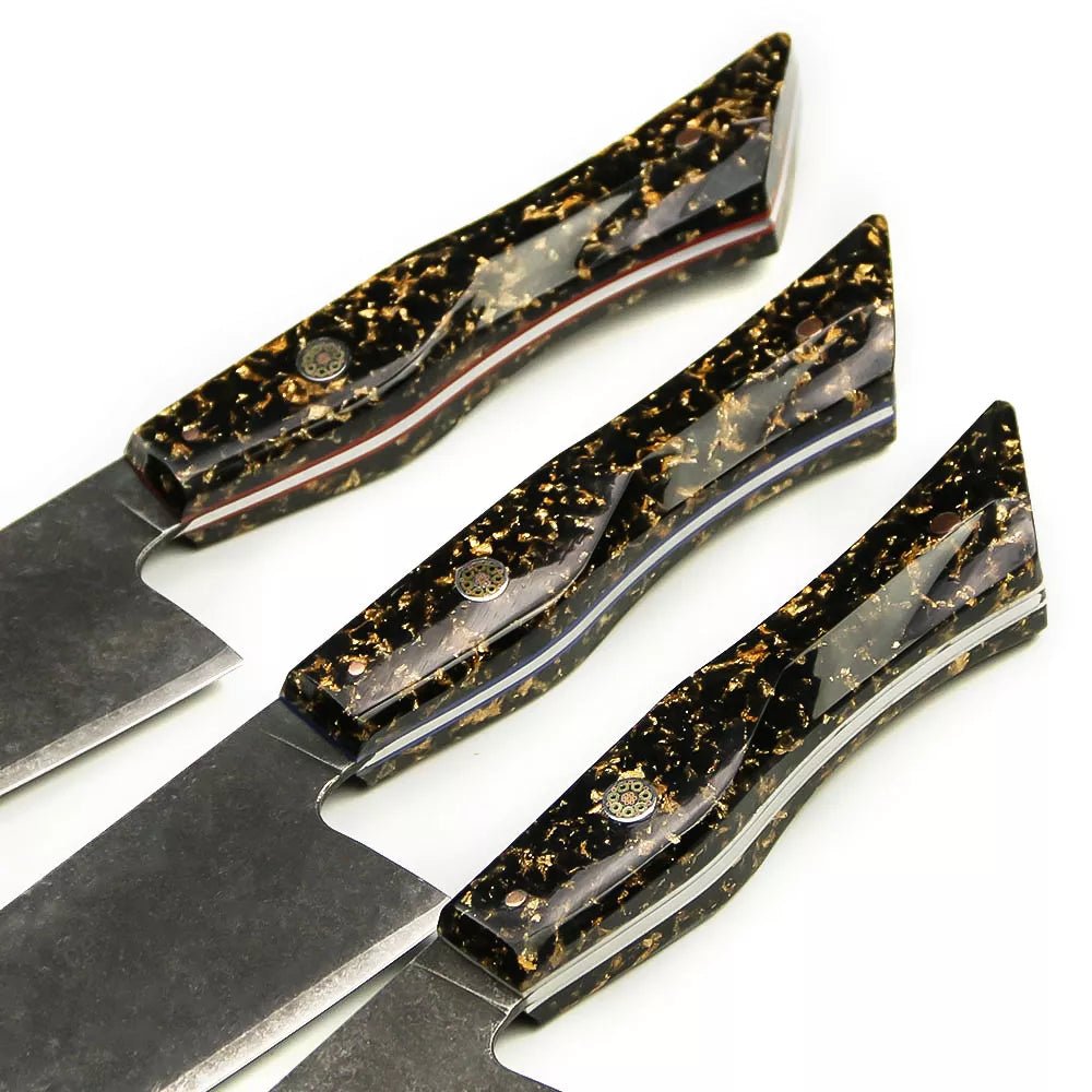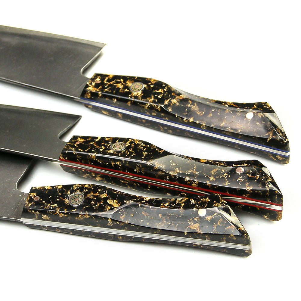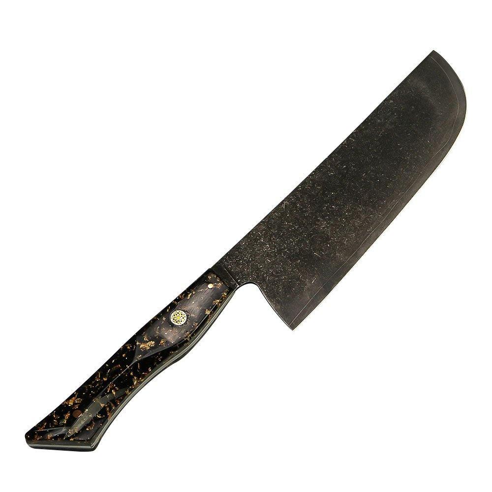 Superior Quality Materials - Crafted from high-quality VG10 stainless steel with a carbon steel content. The knife is manufactured using 3-layer Japanese VG10 steel with a Kurouchi finish. The blade is sharp and hard and is conducive to long-term use. The knife blade has a hardness rating of 60HRC, and a Sharpness taper grinding of 6-9N. The resin handle is finished with gold-leaf inlay specks.