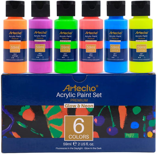 Artecho Glow in the Dark Paint - Set of 6 Colours, 60ml Acrylic Paints