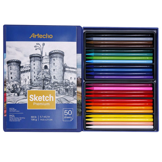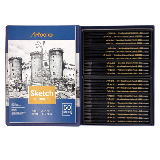 Artecho Premium Black Charcoal 24 Woodless Pencil Set & 50 Page Sketch Pad