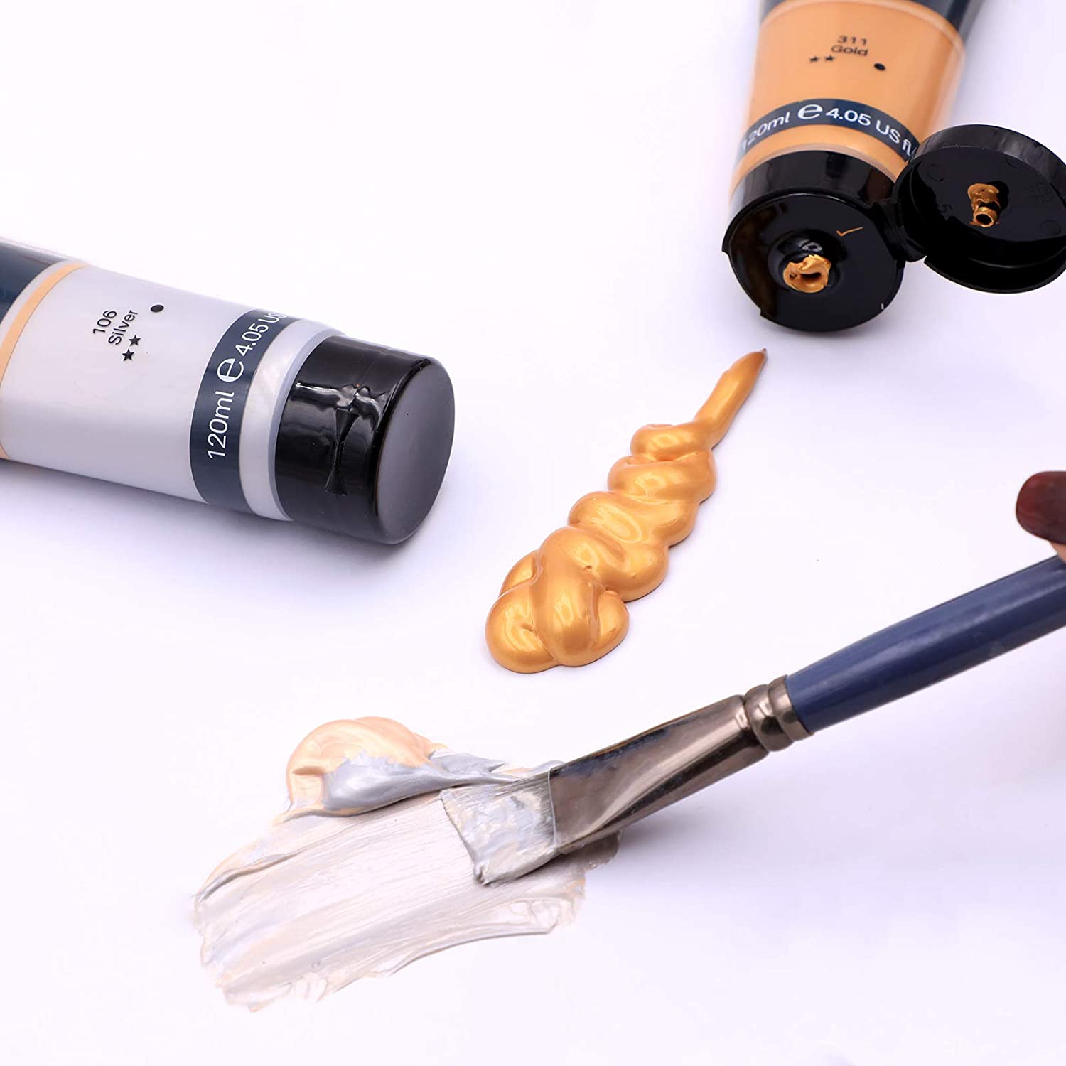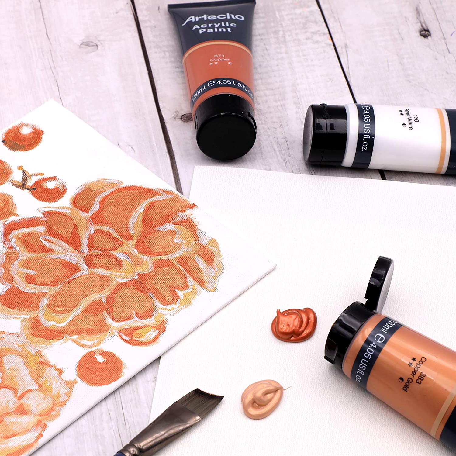 Artecho Metallic Acrylic Paint Set: - This set includes 8 vibrant earth tone colours in 120ml tubes: Champagne Gold, Rose Gold, Gold, Copper Gold, Copper, Pearl White, Silver, and Pearl Black.