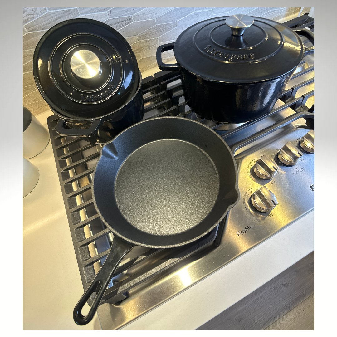 This 3-pc Cast Iron Black Enamel Pot & Skillet Set is a timeless investment for your kitchen that promises exceptional durability and cooking performance.