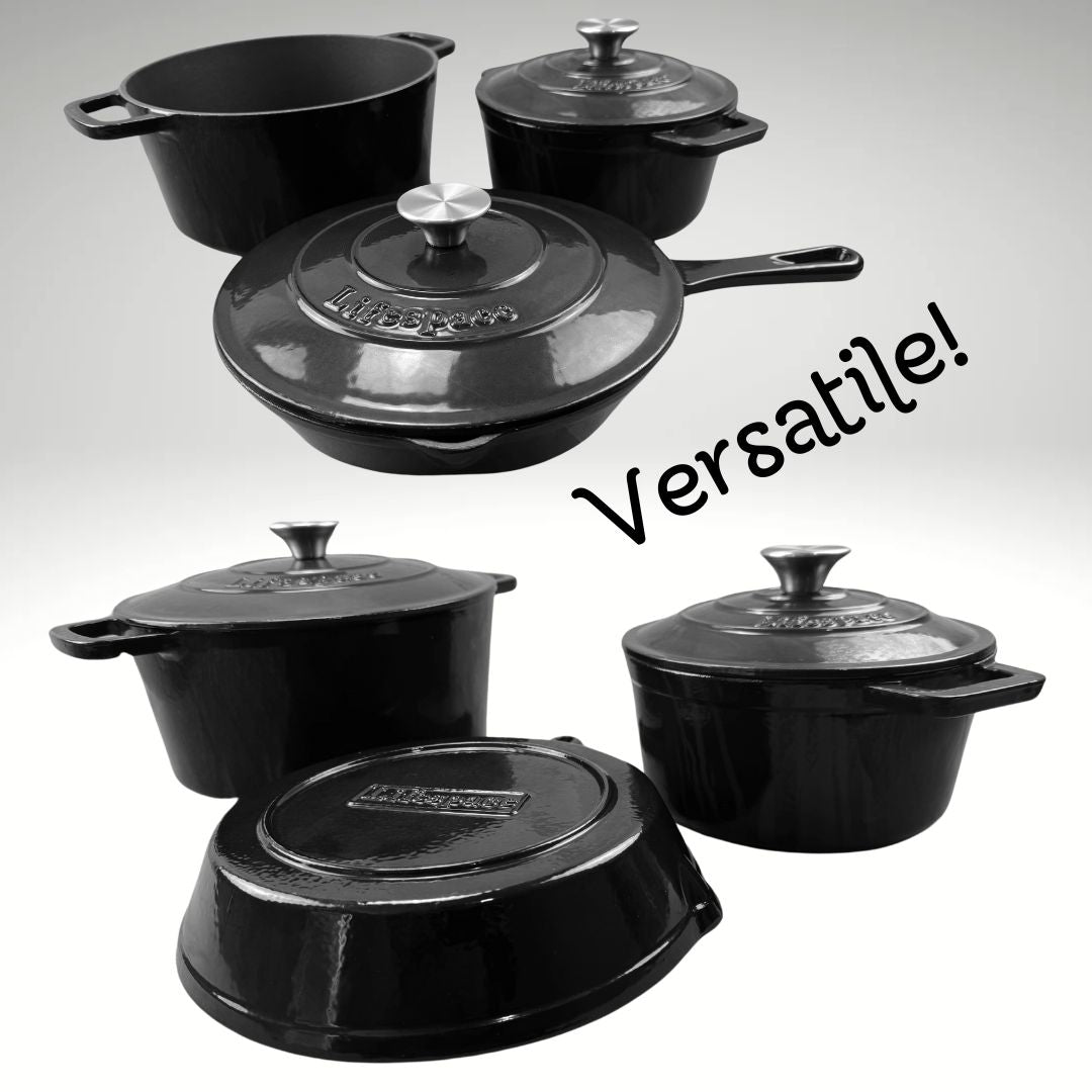 Introducing the Lifespace 5-pc Black Enamel Cast Iron Pot & Skillet Set—a versatile and durable addition to any kitchen, braai or cooking area. This exclusive set includes two cast iron pots with lids and a cast iron skillet, where the lid of the large pot also fits the skillet. Built to last and dishwasher safe, this set is designed to serve you for many years.