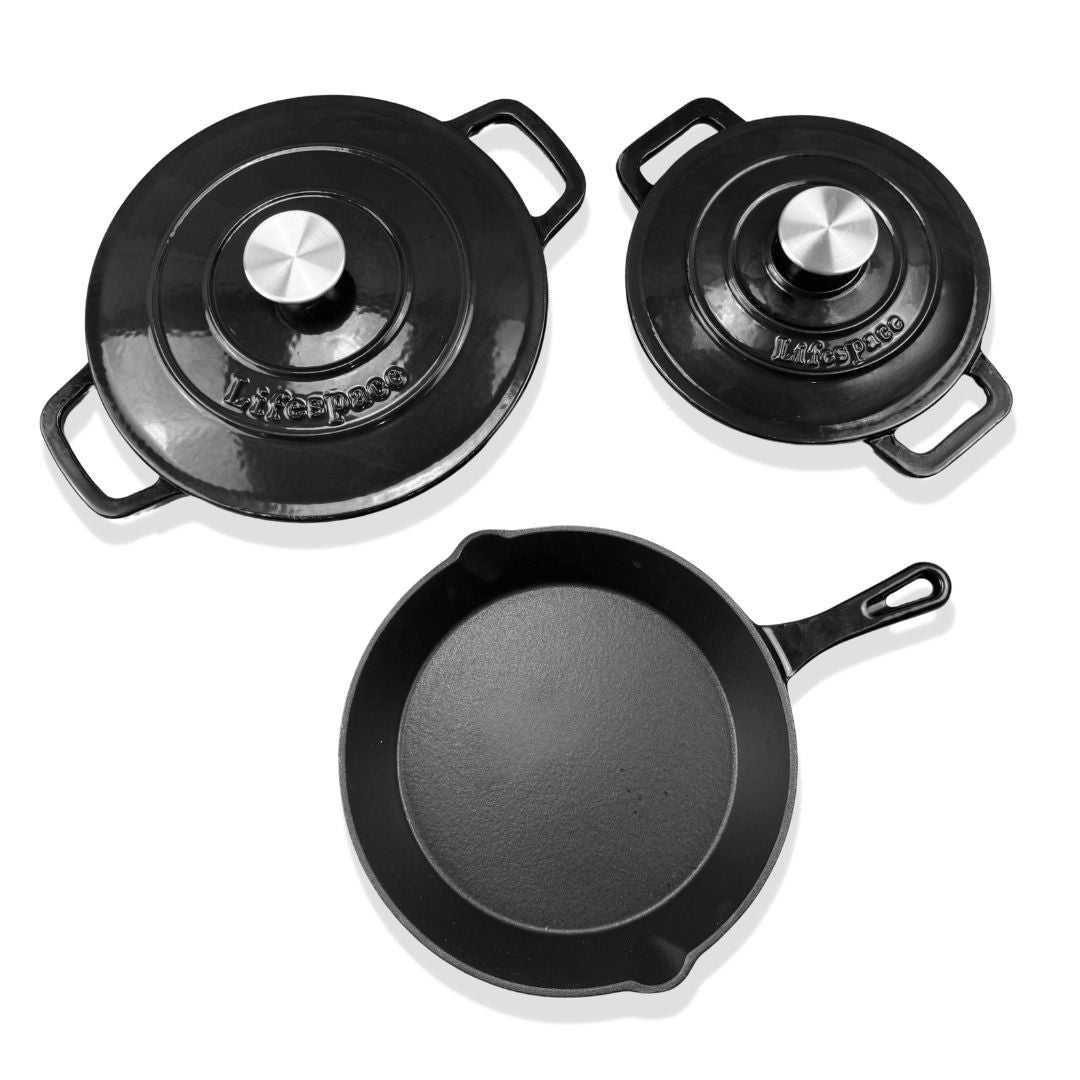 Whether you're cooking on the stovetop, in the oven, or over a campfire, the Lifespace Cast Iron Set can handle it all. These pots and skillet are ideal for baking bread, preparing casseroles, frying, grilling, and more. Their adaptability makes them a must-have for anyone who loves to cook.