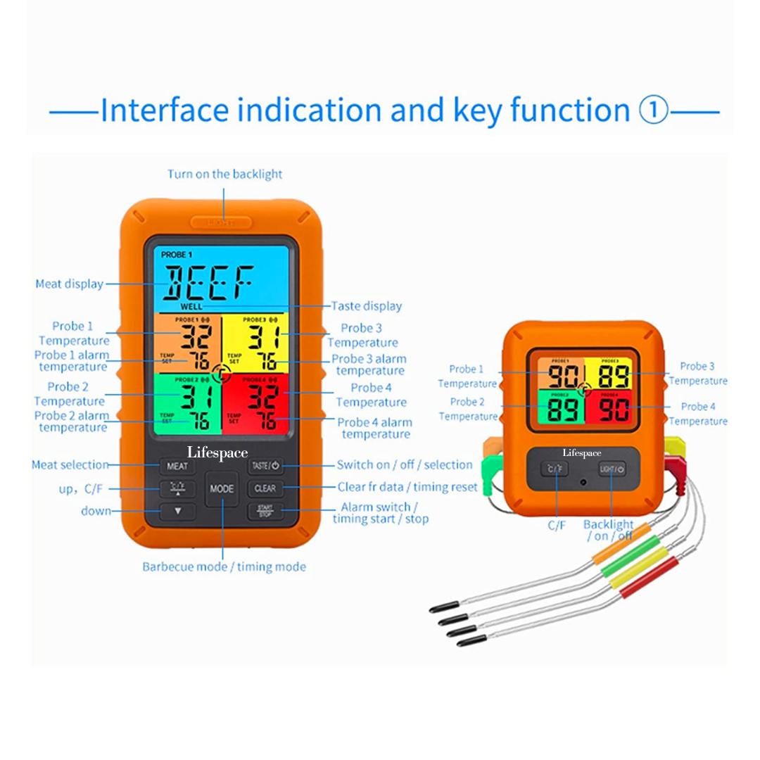 Four Probes for Versatility - With four food-grade stainless steel probes, this wireless meat thermometer offers unmatched flexibility. Whether you're grilling multiple meats or monitoring different pieces simultaneously, this thermometer has you covered.