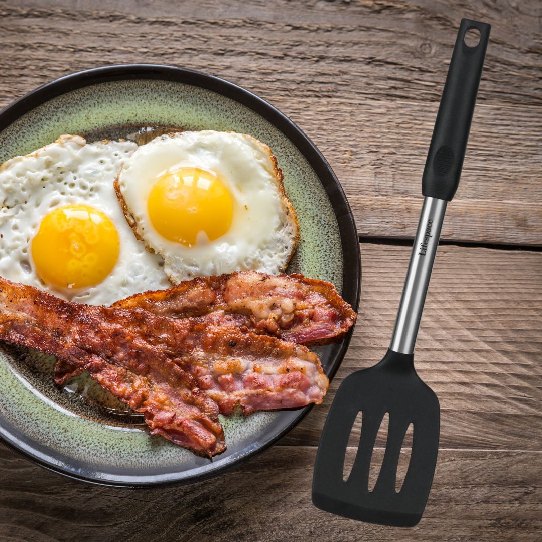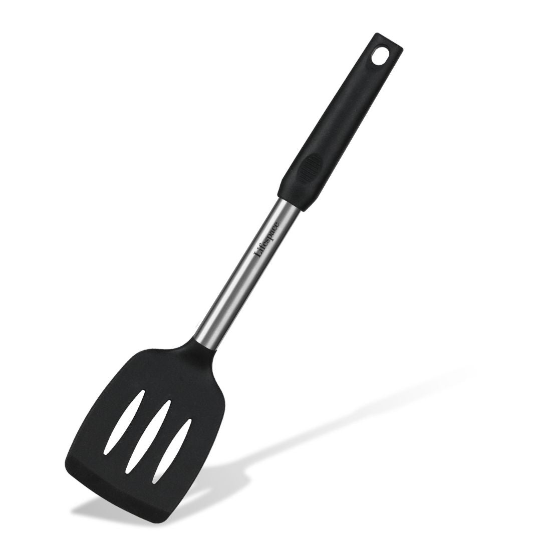 Ergonomic and Thoughtful Features: The stainless steel handles are encased in a silicone sleeve for superior heat insulation and a non-slip, ergonomic grip, providing maximum comfort and control. The slotted turner and spoon are designed to drain excess grease, allowing you to create healthier meals with ease. With a stylish black and metallic silver finish, this set complements any kitchen décor, adding a touch of modern elegance.