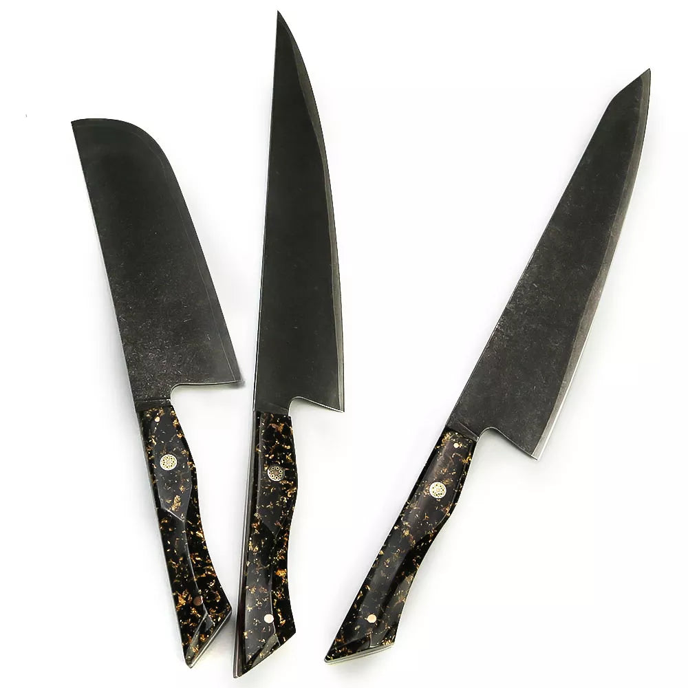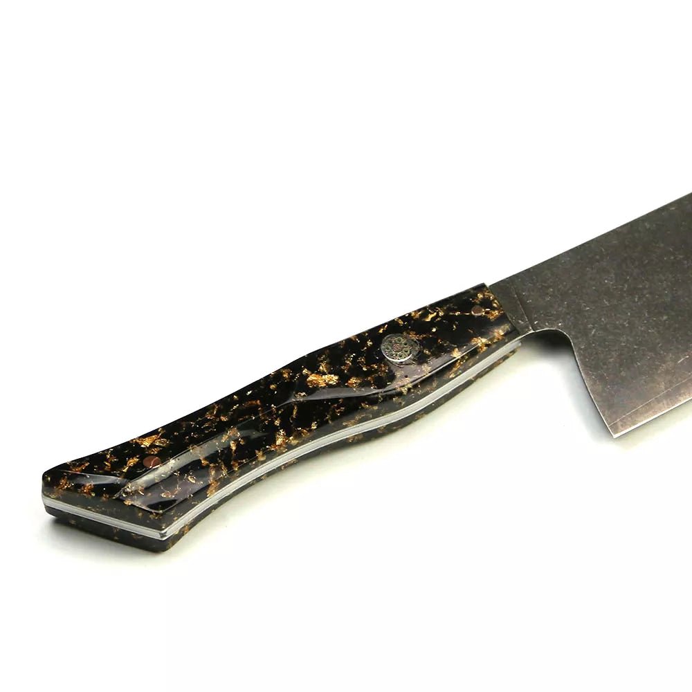 Superior Quality Materials - Crafted from high-quality VG10 stainless steel with a carbon steel content. The knife is manufactured using 3-layer Japanese VG10 steel with a Kurouchi finish. The blade is sharp and hard and is conducive to long-term use. The knife blade has a hardness rating of 60HRC, and a Sharpness taper grinding of 6-9N. The resin handle is finished with gold-leaf inlay specks.