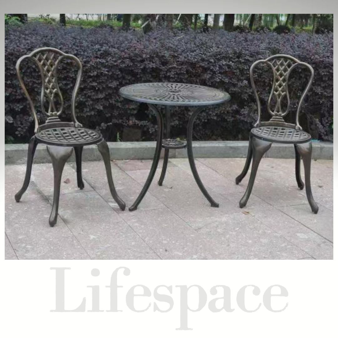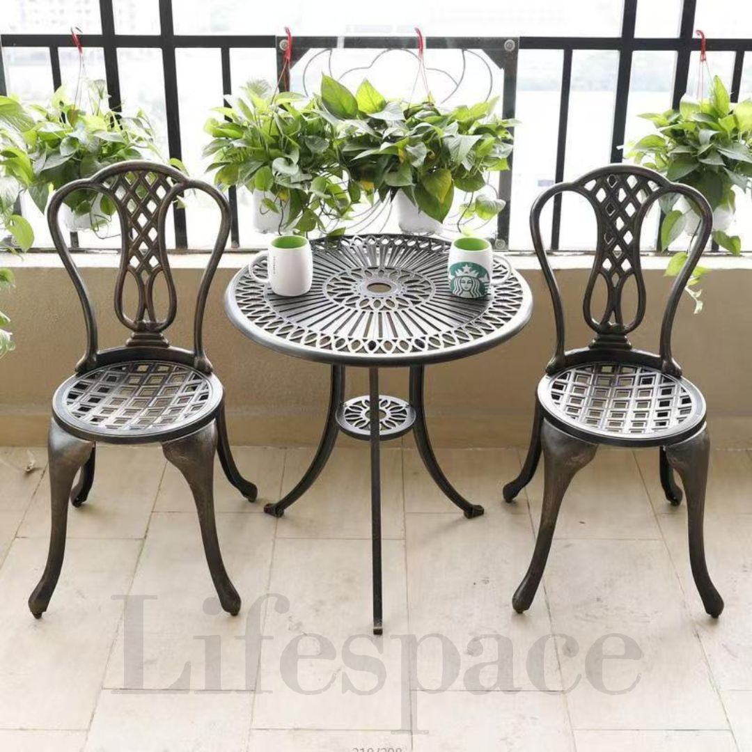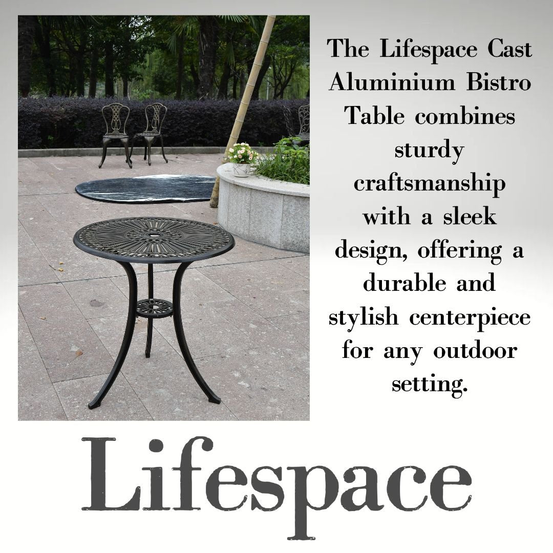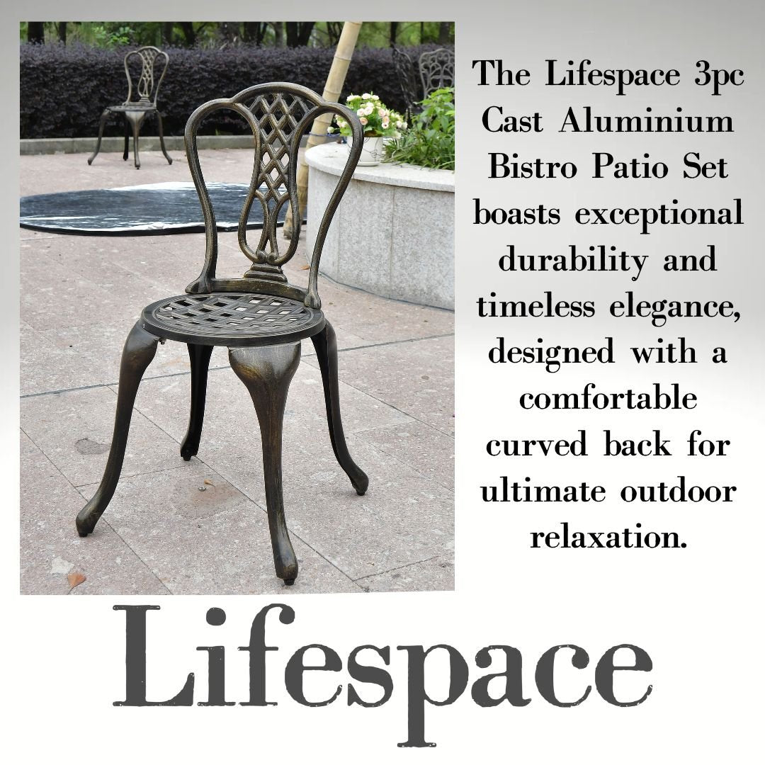 Elevate your outdoor space with the Lifespace 3pc Cast Aluminium Bistro Patio Set, designed for both style and functionality. This elegant bistro set features a beautifully crafted curved back design, adding a touch of classic charm to your garden, balcony, patio, or any outdoor area. Whether you're enjoying morning coffee or hosting guests, this set provides the perfect balance of comfort and aesthetic appeal.