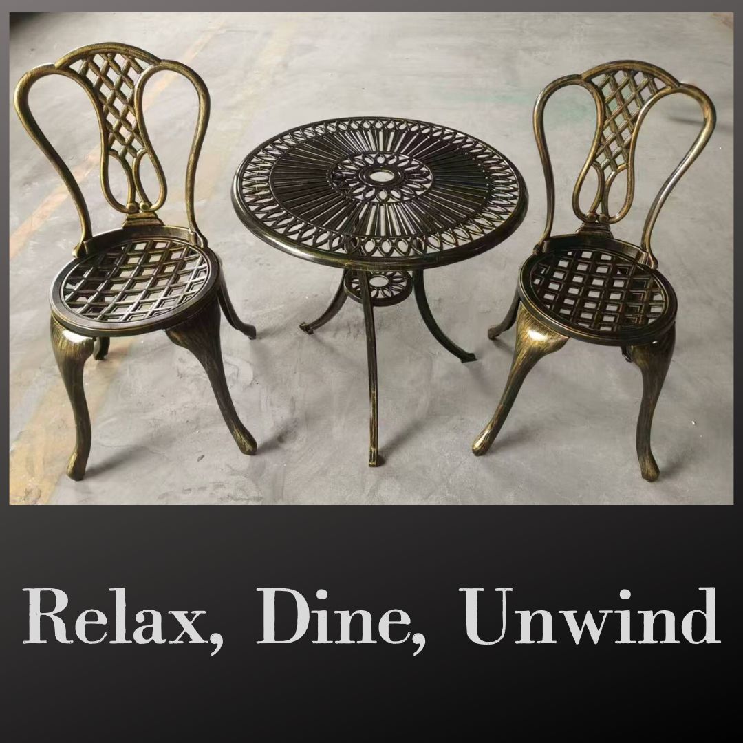 Premium Quality & Durability: Crafted from high-quality cast aluminium, this bistro set is built to withstand the elements, offering outstanding durability. Its rust-resistant material ensures long-lasting use, even in coastal environments where salty air can often cause wear on outdoor furniture. The set’s robust structure promises years of enjoyment without compromising on its sleek design.