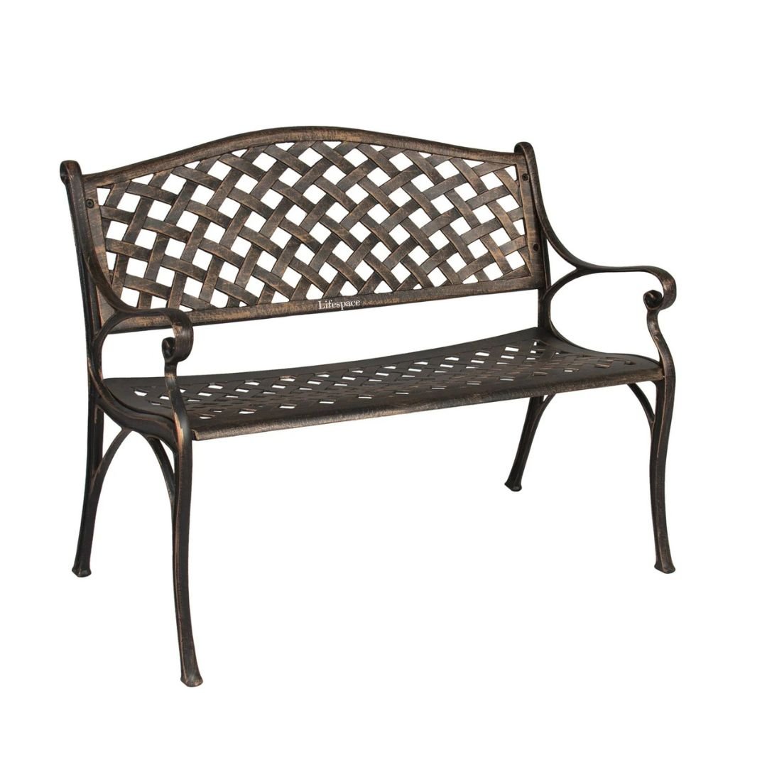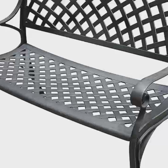 Transform your outdoor or garden area with the Lifespace Cast Aluminium Patio Garden Bench, expertly designed for both style and comfort. This beautifully crafted outdoor bench features a wide seat with comfortable backrest an armrests for enhanced relaxation. The bench has a stunning criss-cross pattern that adds a touch of classic elegance to any garden, balcony, or patio. Whether you're enjoying a quiet cup of coffee or relaxing with a book, this garden bench strikes the perfect balance between sophisticated design and ergonomic comfort.
