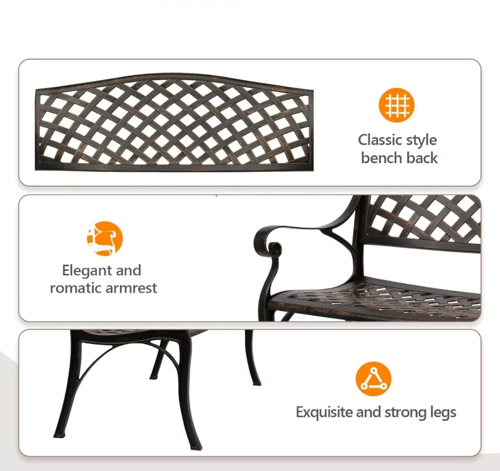 Premium Quality and Durability: Made from high-quality cast aluminium, this garden bench is built to last through all seasons. Its rust-resistant and sturdy construction ensures that it remains a durable fixture in any outdoor setting, including coastal environments where salty air can often cause damage. The robust materials guarantee long-lasting performance while maintaining the bench's refined aesthetic.