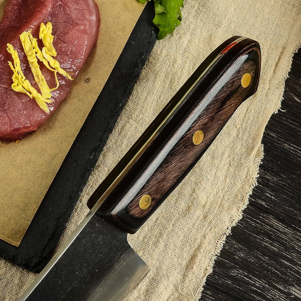 Premium Handle Design - The knife is beautifully finished with a dark brown Pakka Wood handle. The full tang handle is firmly bolstered with three brass rivets, ensuring durability and longevity. The handle's ergonomic design provides a comfortable grip, making it easy to use for extended periods without fatigue.