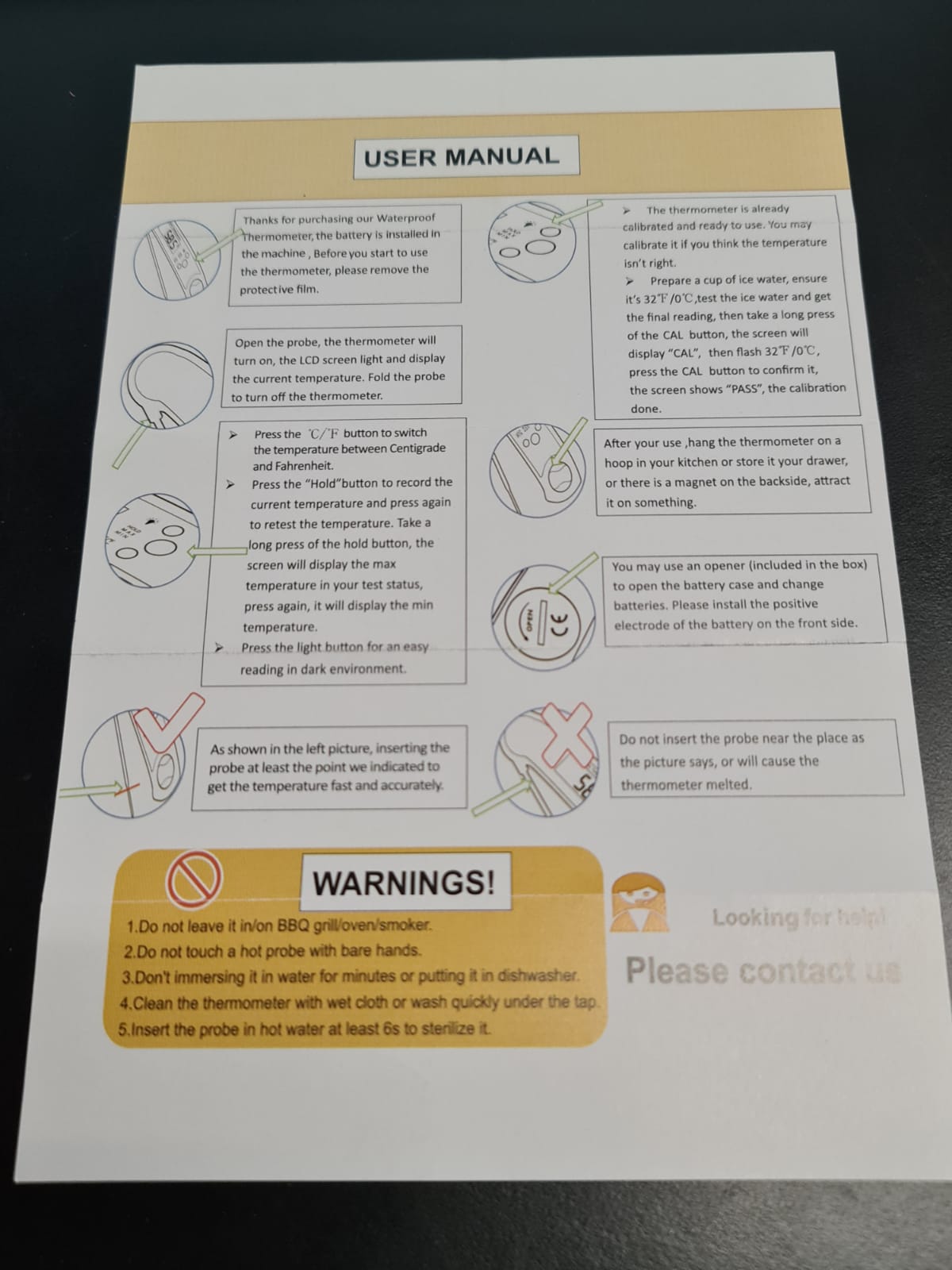 Care instructions - Do not touch the hot probe with bare hands or leave the thermometer in the oven while cooking. Do not completely immerse the digital thermometer in water for extended periods. Please wash the stainless steel probe with soapy water and clean the thermometer by hand.