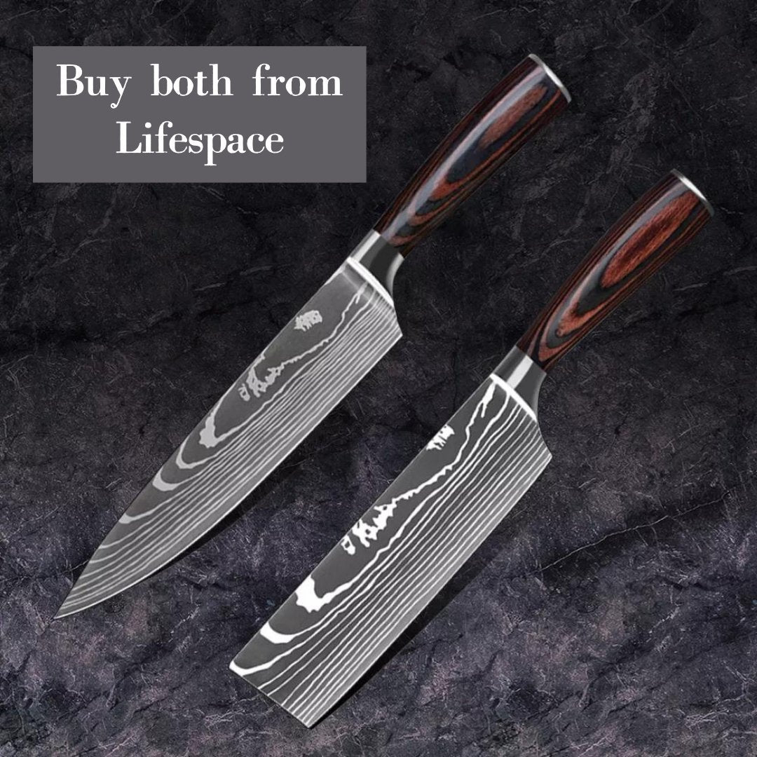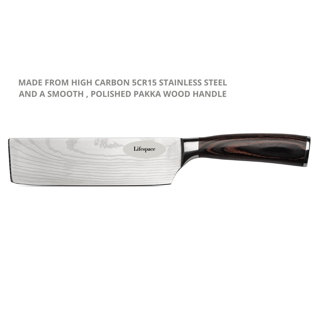 Elevate your culinary experience with the Lifespace Laser Engraved 5CR15 Kitchen Nakiri Chef Knife where performance meets aesthetic appeal.