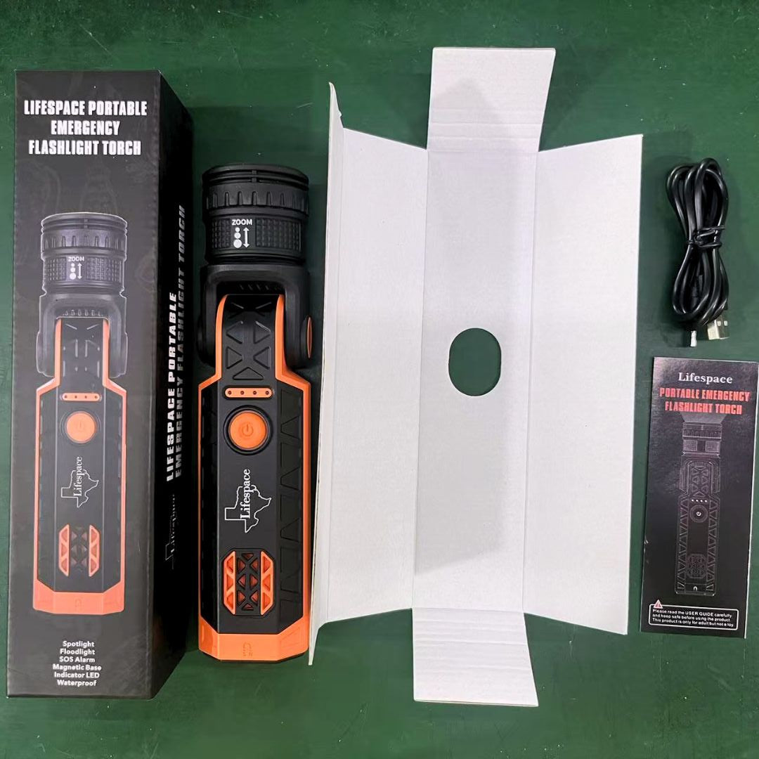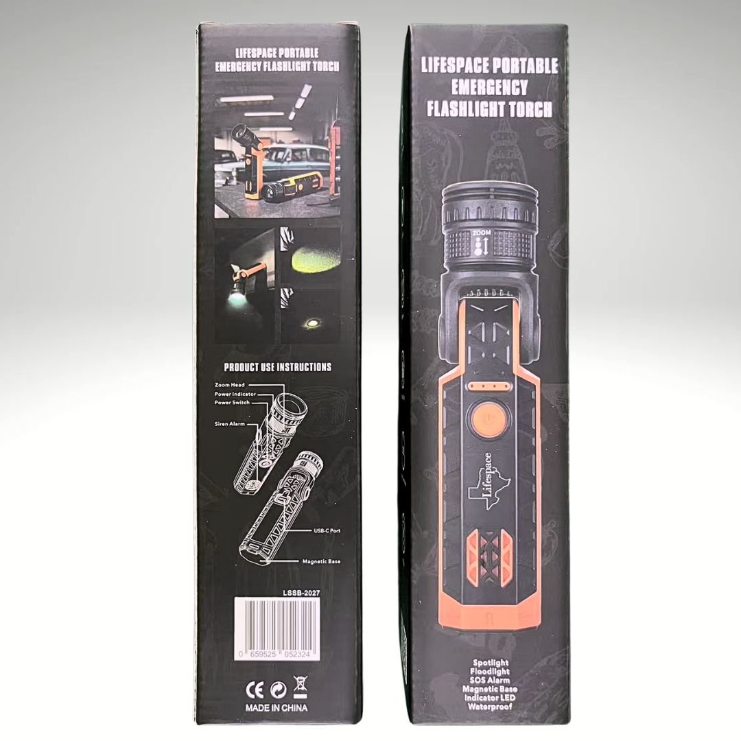 Equipped with a USB-C rechargeable battery (cable included), this flashlight offers convenience and adaptability with three light settings—spotlight, floodlight, and adjustable focus—plus an SOS siren alarm for emergencies. Whether you’re hiking, working, or facing an unexpected blackout, the Lifespace 3-in-1 combines practicality with peace of mind.