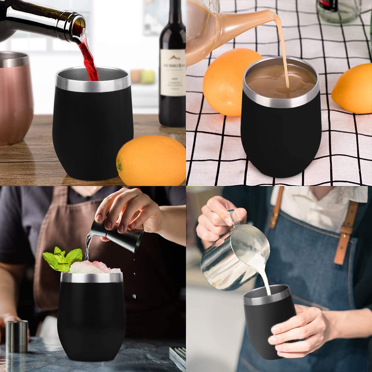 Stylish Design - With a 12oz (350ml) capacity, our wine tumblers are specially designed for you to enjoy wine, coffee, or any beverage of your choice. The curved body provides a comfortable grip, while the advanced technology coating adds a touch of elegance to any occasion. Whether you're hosting a party, enjoying the outdoors, or relaxing at home, these vacuum wine tumblers are the perfect accessory.